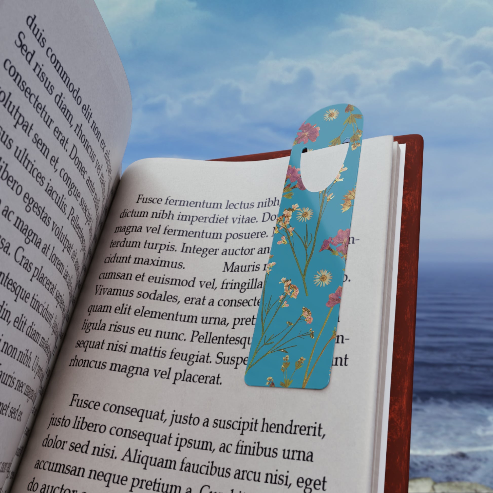 A floral-themed bookmark made from light-weight aluminum, featuring vibrant colors and rounded edges for a convenient grip. This bookmark is perfect for avid readers who enjoy adding a touch of creativity to their reading experience.