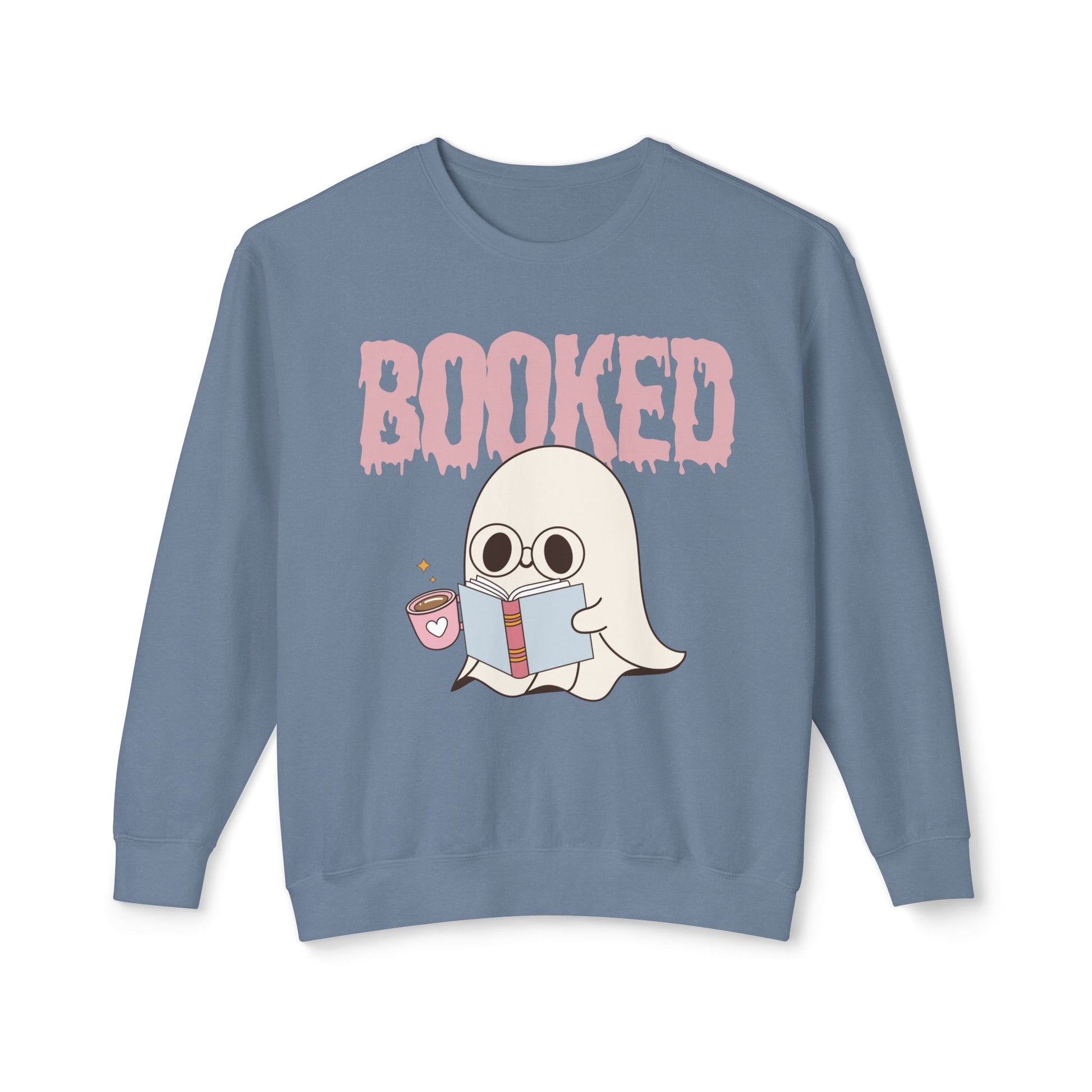 Stay cozy and cute with this unisex lightweight crewneck sweatshirt featuring a cute design of a ghost reading a book while sipping on coffee. Perfect for book lovers who enjoy a whimsical and spooky vibe. Ideal for lounging at home, chilly days, Halloween, or anyone who loves a unique and fun sweatshirt.
