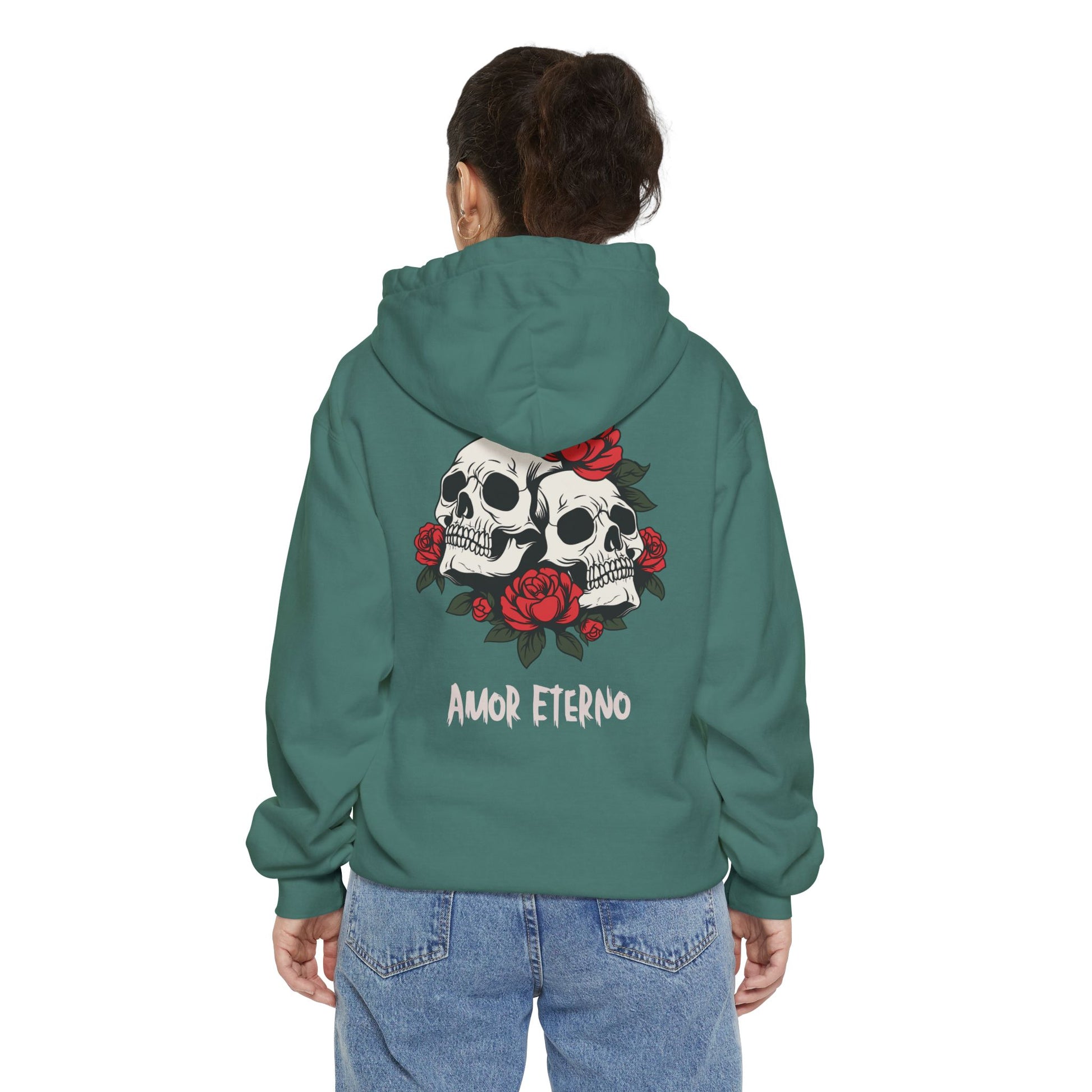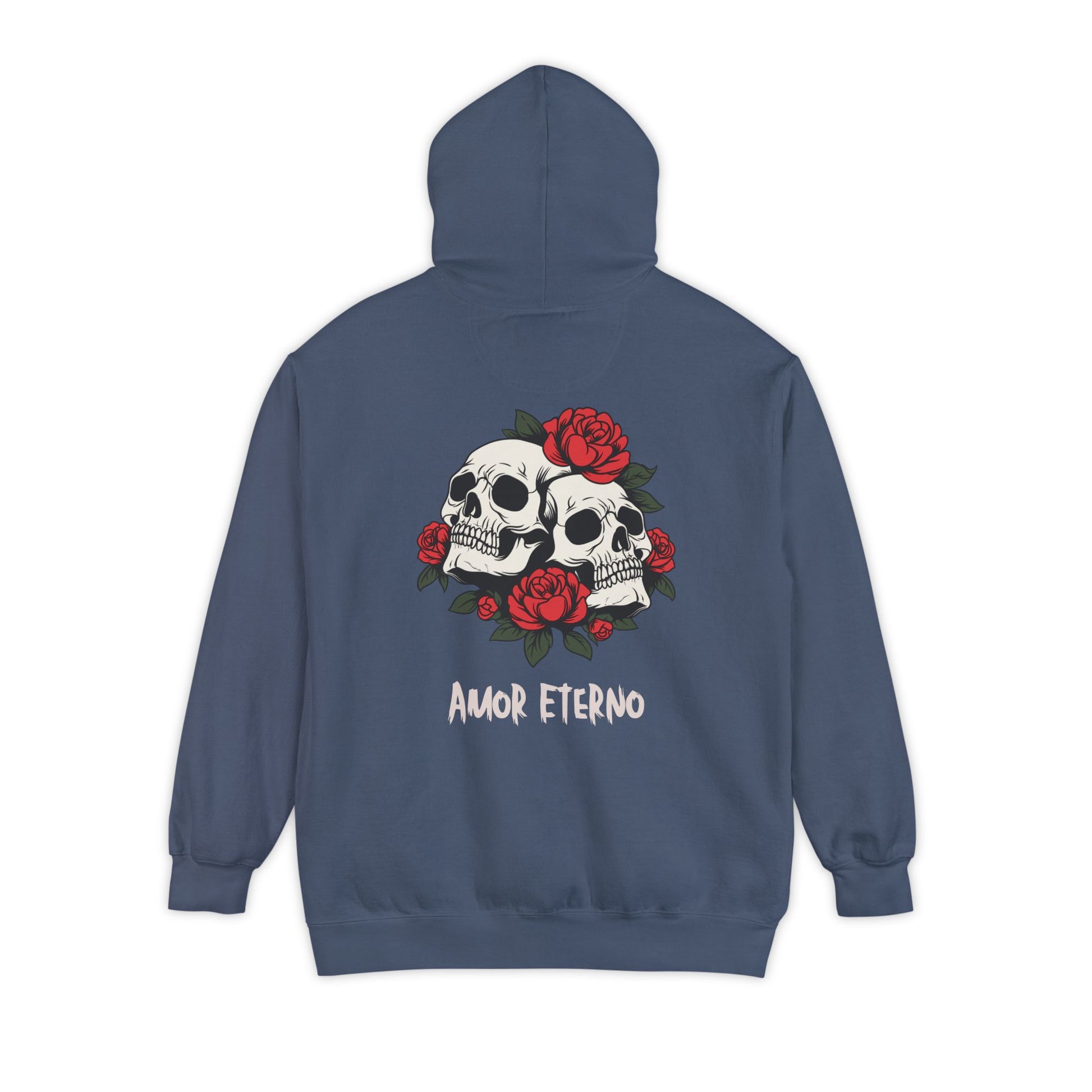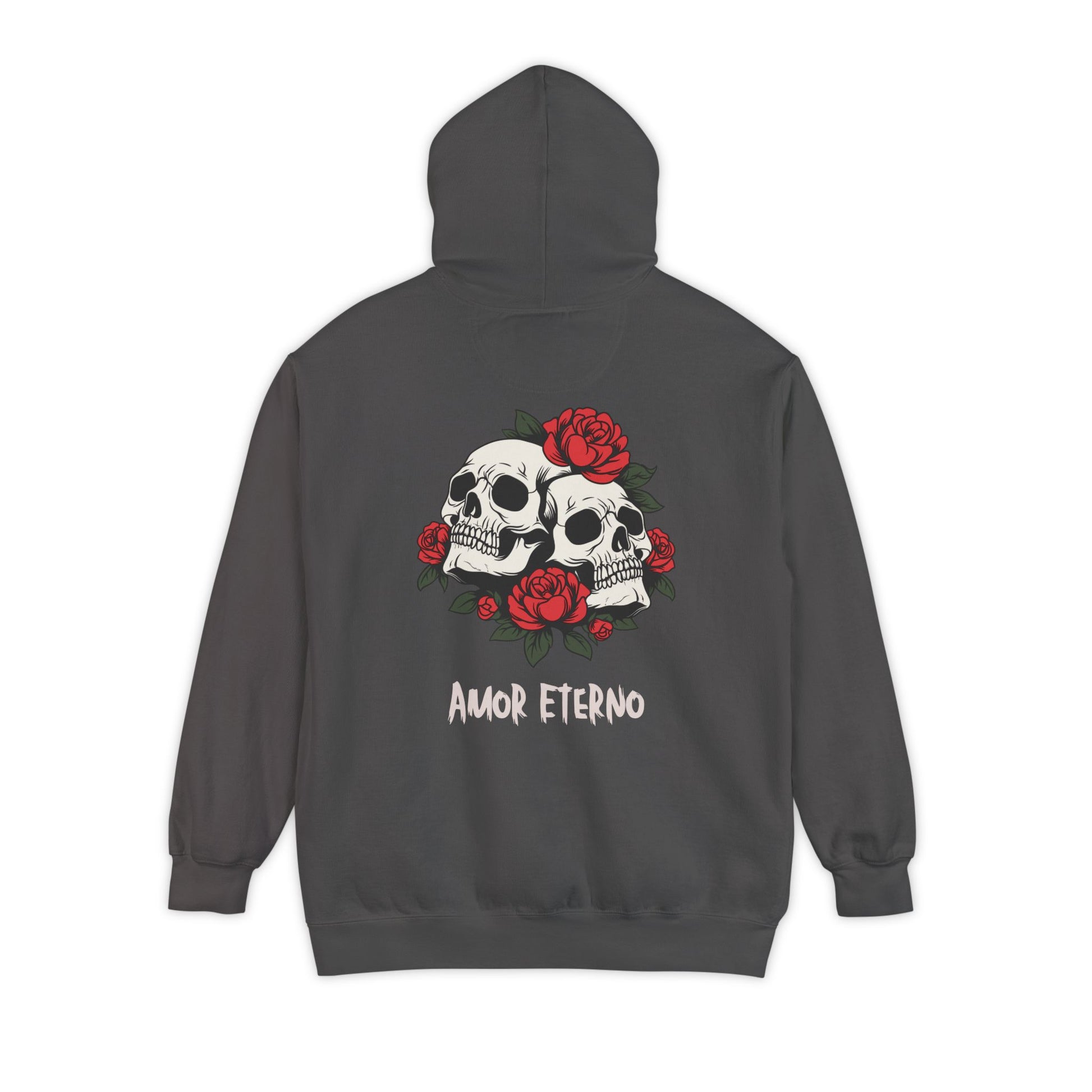 This Hoodie features a unique design with the words 'Amor eterno' surrounded by skulls and roses, giving off a edgy and romantic vibe. Perfect for those who love alternative style and want to make a statement. Ideal for Valentine's Day, Dia de los Muertos, or Halloween.