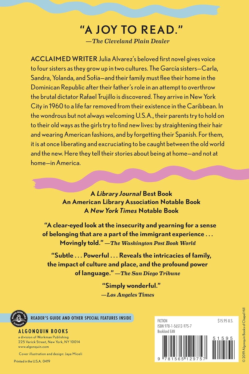 Acclaimed writer Julia Alvarez’s beloved first novel gives voice to four sisters as they grow up in two cultures. The García sisters—Carla, Sandra, Yolanda, and Sofía—and their family must flee their home in the Dominican Republic after their father’s role in an attempt to overthrow brutal dictator Rafael Trujillo is discovered. They arrive in New York City in 1960 to a life far removed from their existence in the Caribbean. In the wondrous but not always welcoming U.S.A., their parents try to hold on to their old ways as the girls try find new lives: by straightening their hair and wearing American fashions, and by forgetting their Spanish. For them, it is at once liberating and excruciating to be caught between the old world and the new. Here they tell their stories about being at home—and not at home—in America.