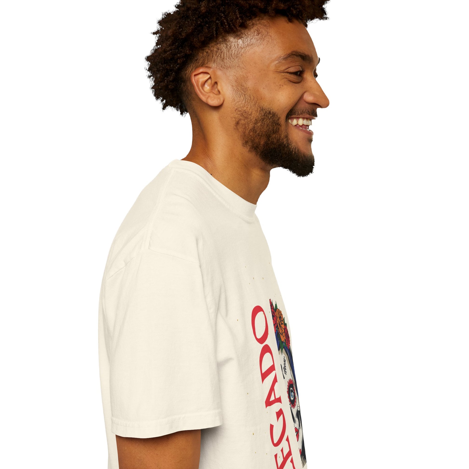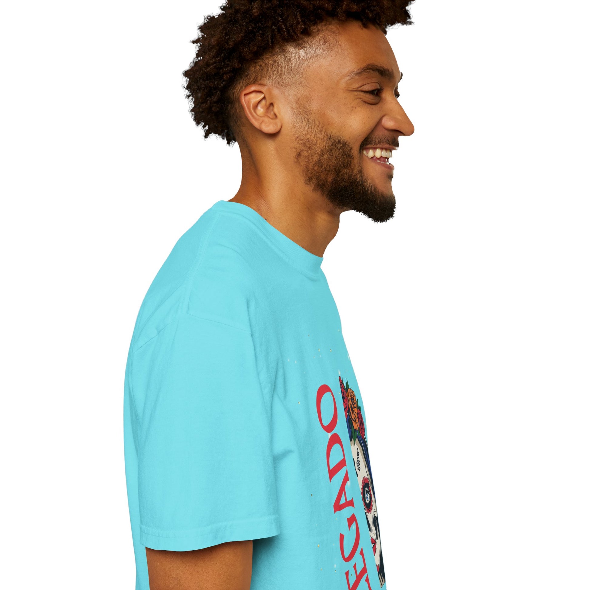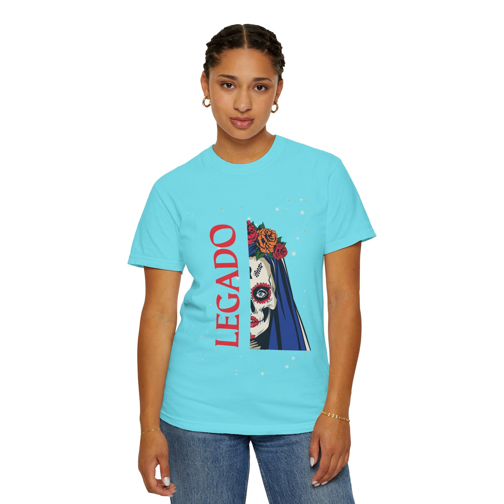 A comfortable and stylish unisex garment-dyed T-shirt featuring Legado with half-faced catrina design. This tee is perfect for those who appreciate unique and artistic prints, suitable for casual wear or as a statement piece. Ideal for adults looking for a trendy and eye-catching addition to their wardrobe, especially for Day of the Dead festivities.