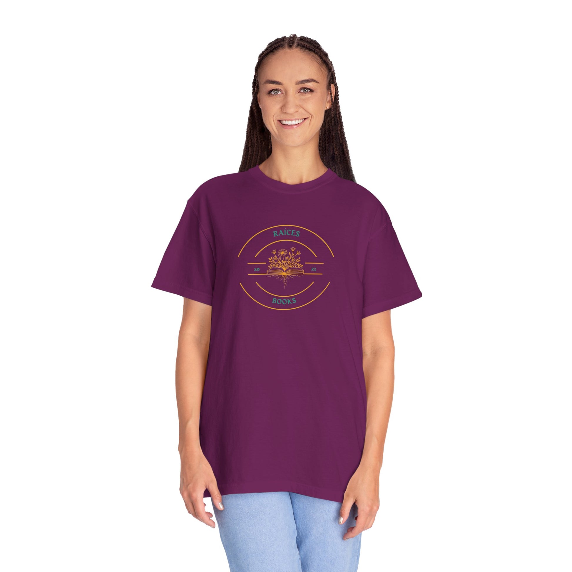 This raices books logo inspired T-shirt is rooted in cultura, perfect for those who appreciate storytelling and cultural heritage. The soft color and texture of the garment gives a cozy vibe, making it a great addition to your casual wardrobe. Ideal for adults who love celebrating cultural diversity and storytelling. Perfect for occasions like Hispanic Heritage Month celebrations.