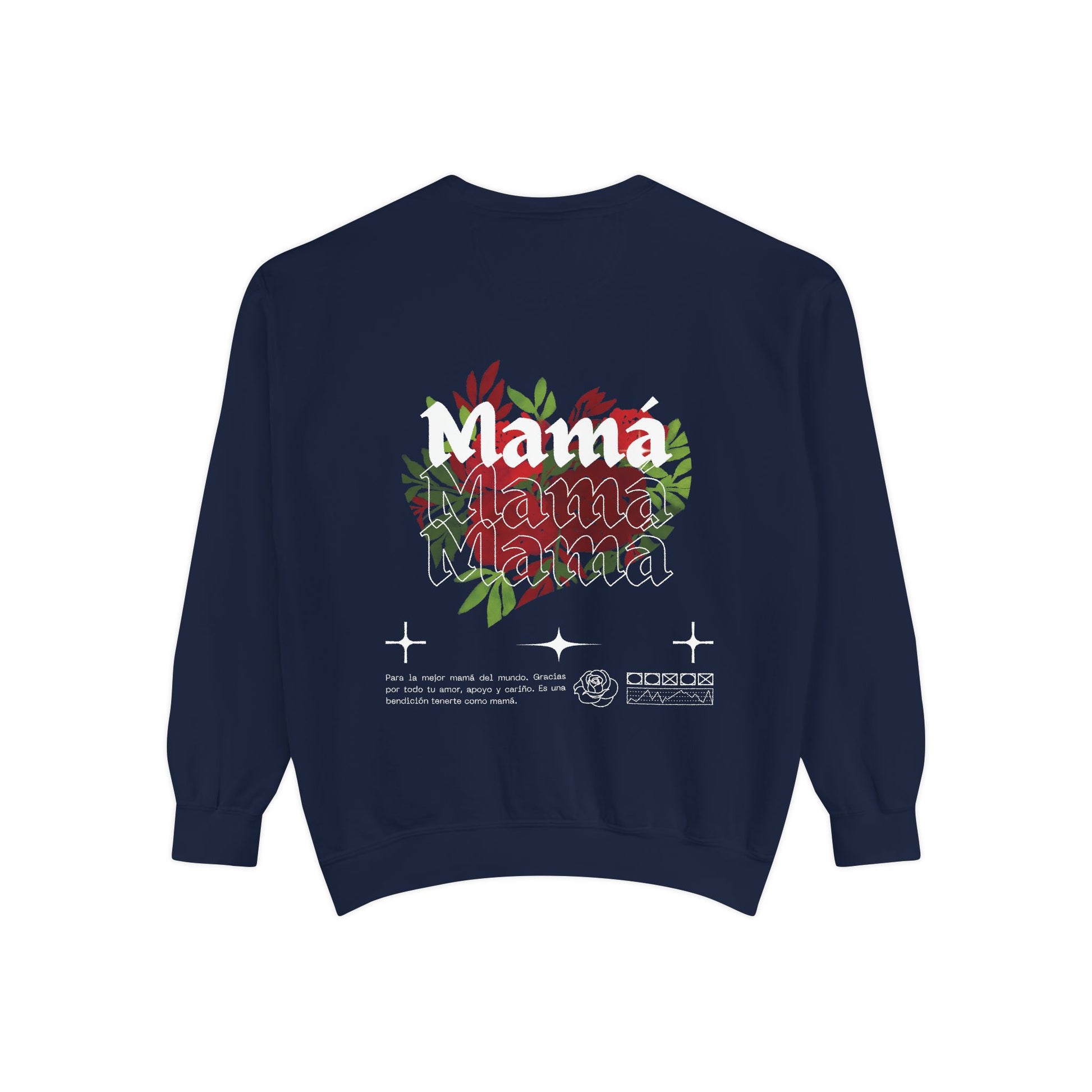 A cozy and stylish unisex garment-dyed sweatshirt with a beautiful design of 'mama' written with a heart of roses. This sweatshirt gives off a warm and loving vibe, making it perfect for everyday wear or as a thoughtful gift for moms on Mother's Day, birthdays, or just to show appreciation. The 1x1 ribbed collar, cuffs, and bottom hem provide a comfortable fit, while the soft 80% cotton, 20% polyester fabric ensures a luxurious feel.