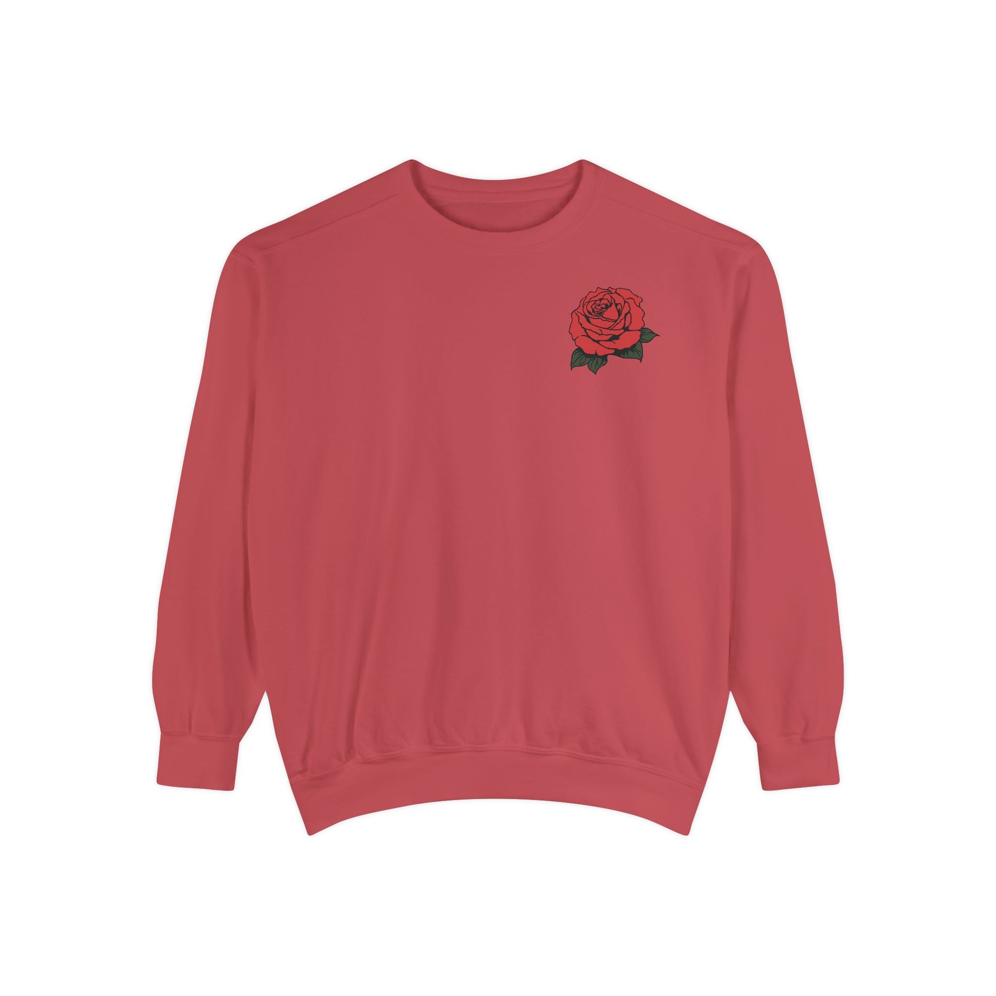 A unique unisex garment-dyed sweatshirt featuring an 'Amor eterno' design with skulls and red roses. This sweatshirt exudes a dark and romantic vibe, perfect for those who appreciate alternative styles. Ideal for those who celebrate Dia de los Muertos or have a love for skull motifs.