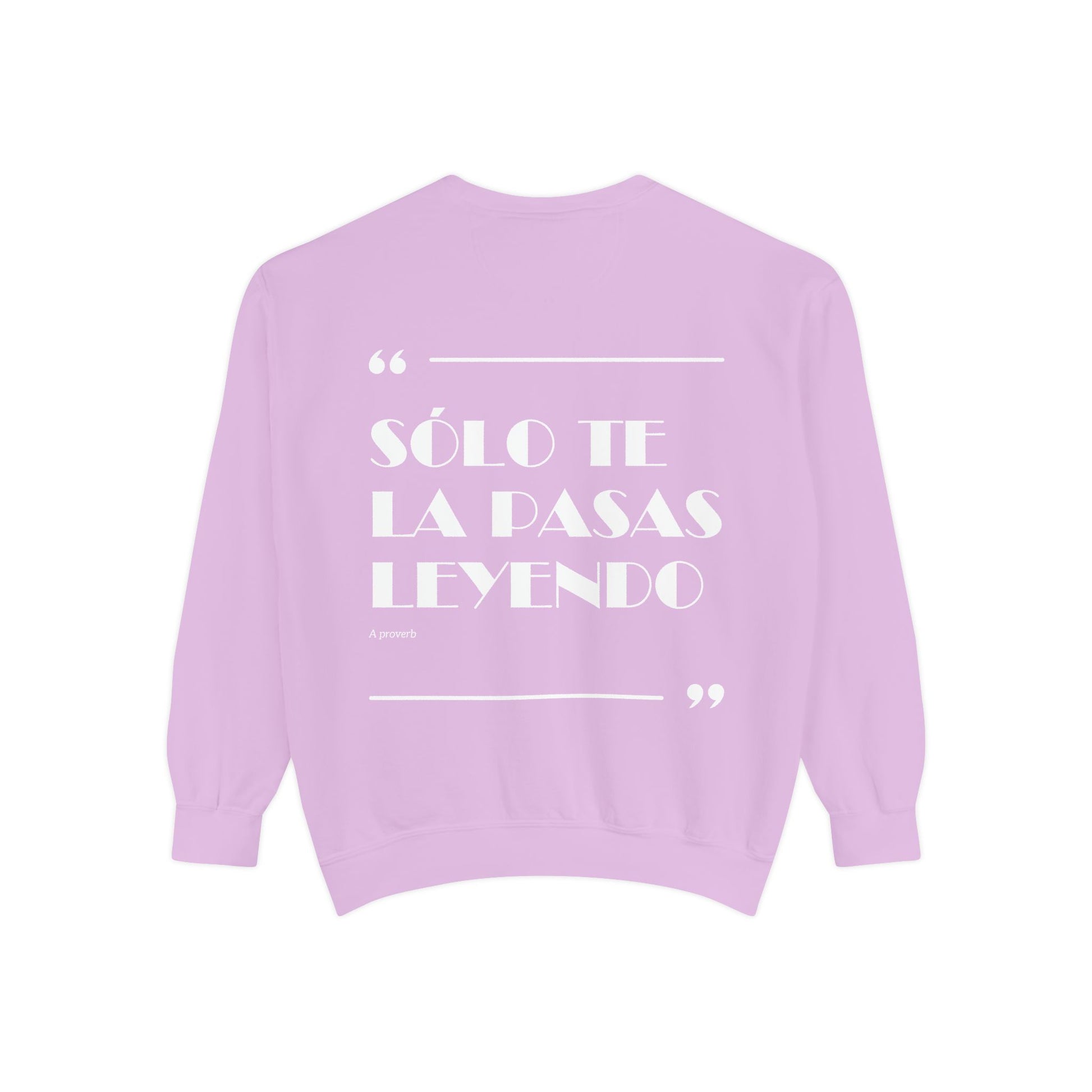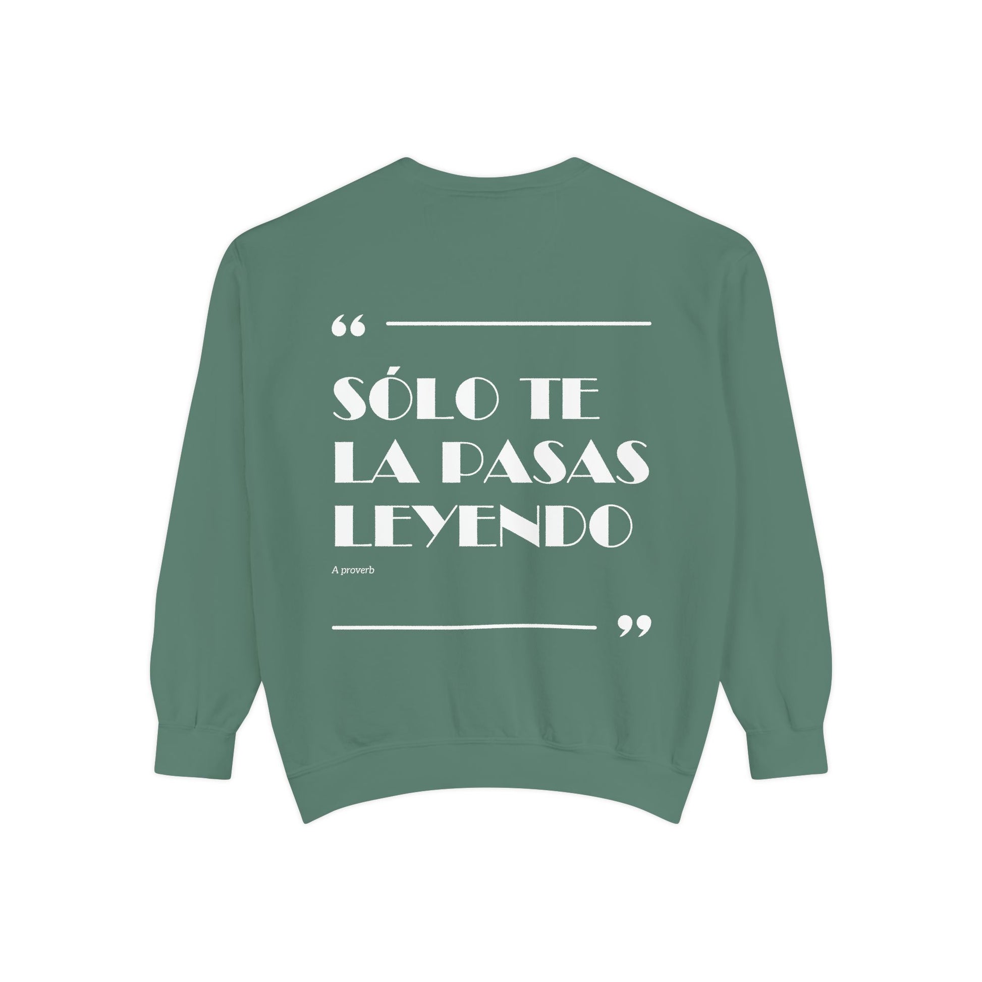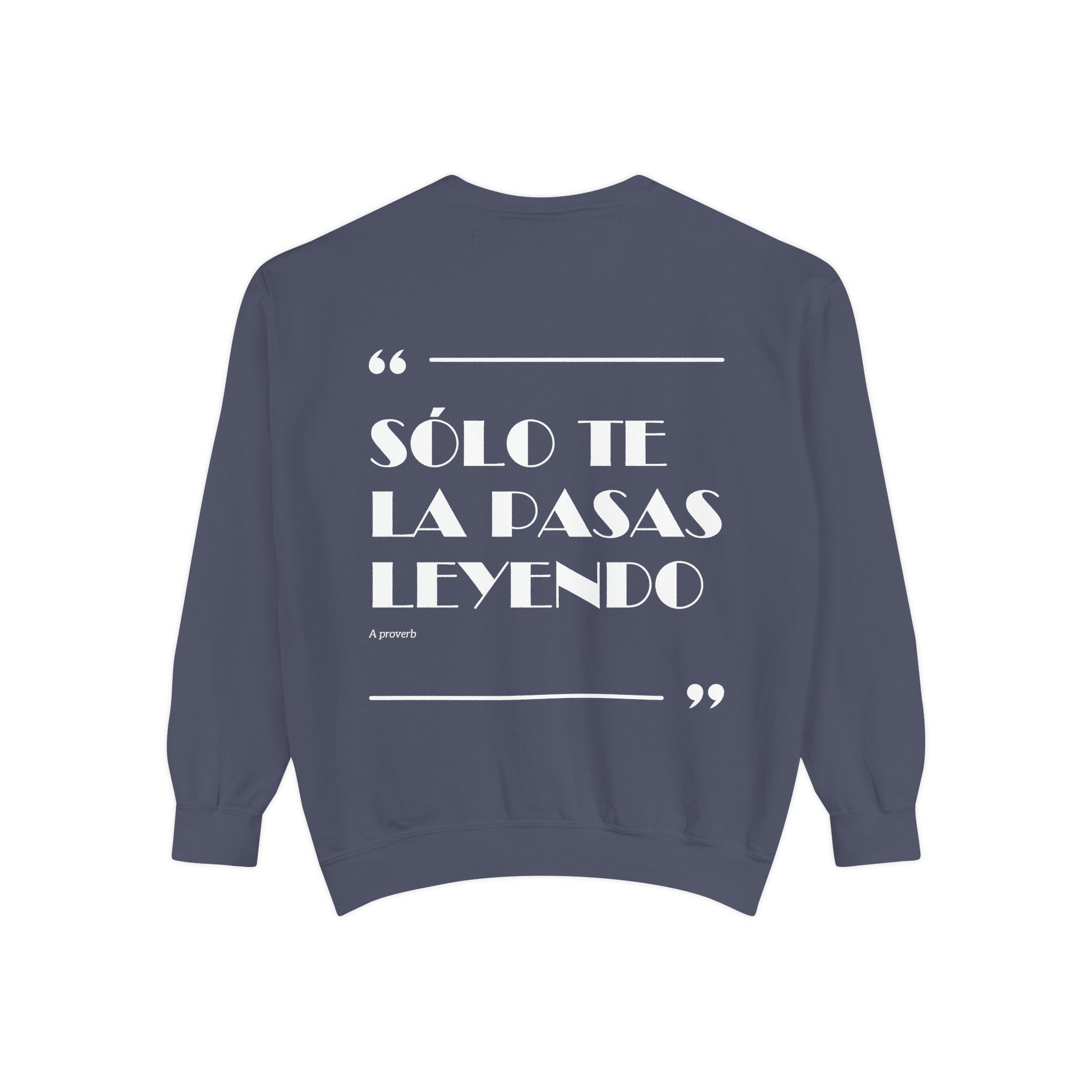 Stay cozy and stylish with our unisex crewneck sweatshirt! Featuring a bold and unique design that says 'Solo Te La Pasas Leyendo,' this sweatshirt is perfect for bookworms and literary enthusiasts. Made with soft and comfortable fabric, it's ideal for lounging at home or layering up for a casual outing. Embrace your love for reading in comfort and style with this must-have sweater.