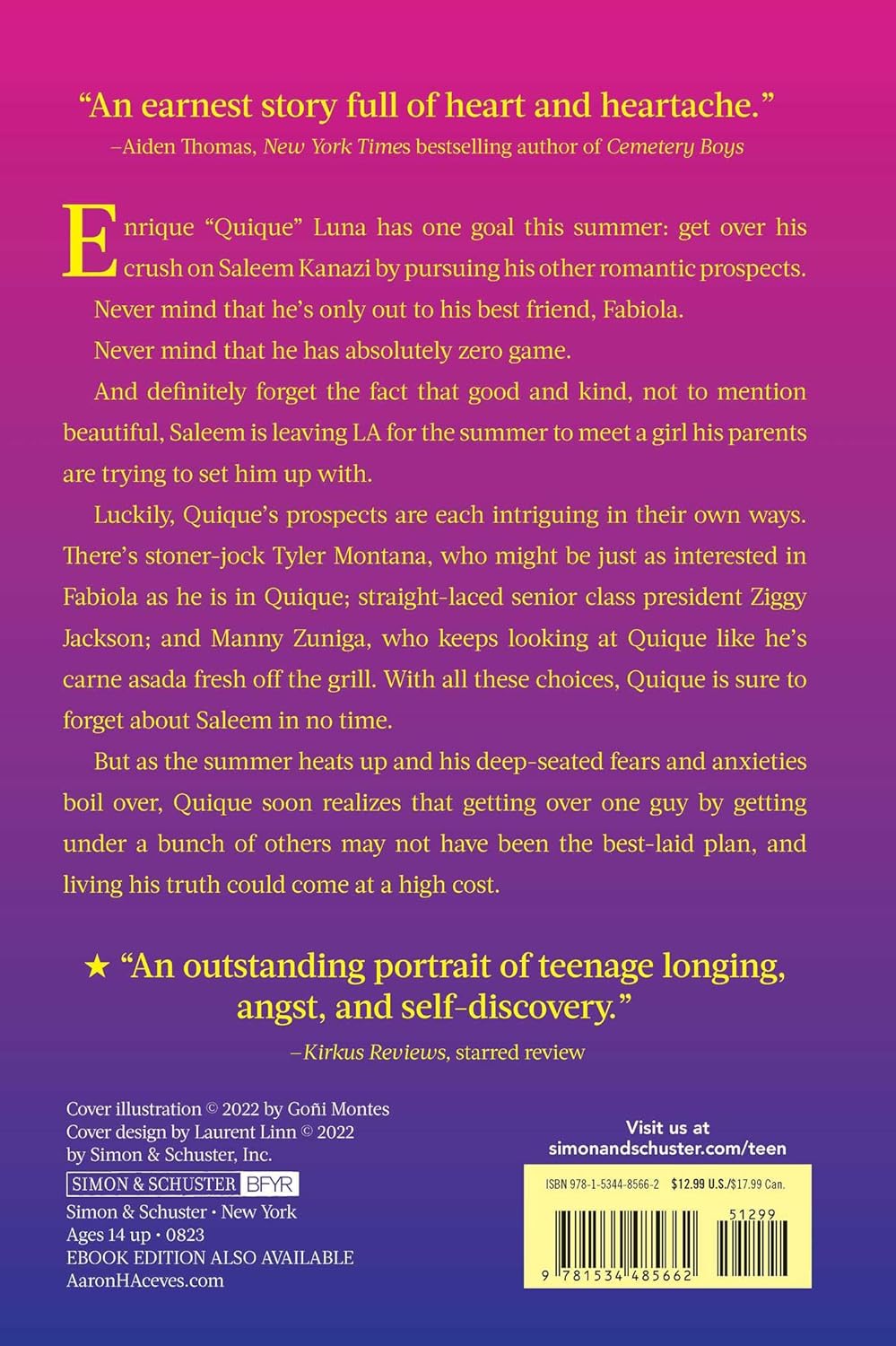 Enrique “Quique” Luna has one goal this summer—get over his crush on Saleem Kanazi by pursuing his other romantic prospects. Never mind that he’s only out to his best friend, Fabiola. Never mind that he has absolutely zero game. And definitely forget the fact that good and kind and, not to mention, beautiful Saleem is leaving LA for the summer to reunite with a girl his parents are trying to set him up with.