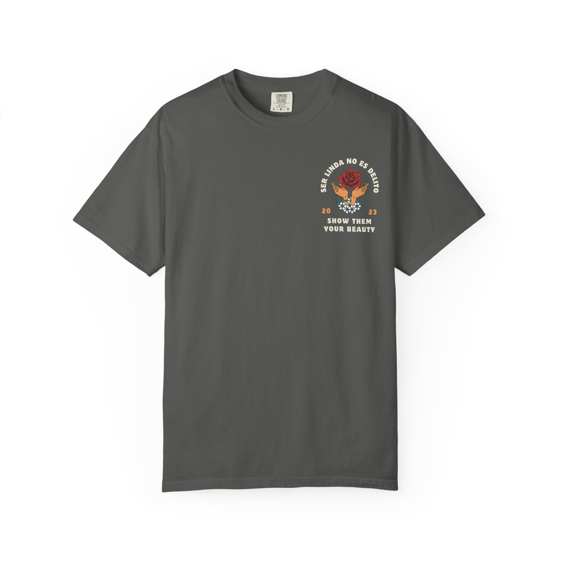 A vibrant and eye-catching unisex garment-dyed t-shirt with the Spanish phrase 'ser linda no es delito' printed on it, promoting body positivity and self-love. Perfect for those who want to make a statement and embrace their beauty. Ideal for casual wear or as a meaningful gift for a loved one. Relevant for International Women's Day, Hispanic Heritage Month, and everyday empowerment.